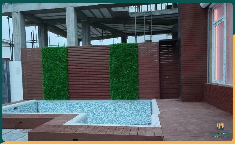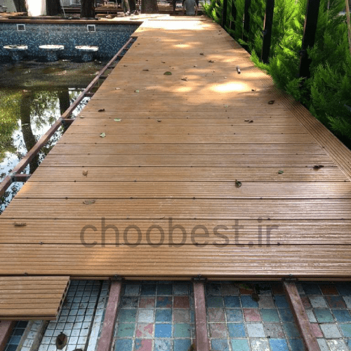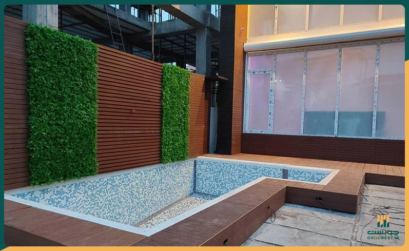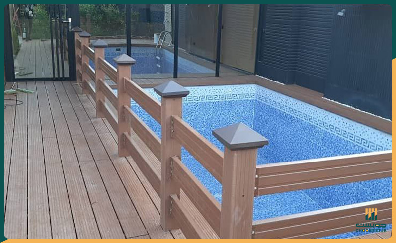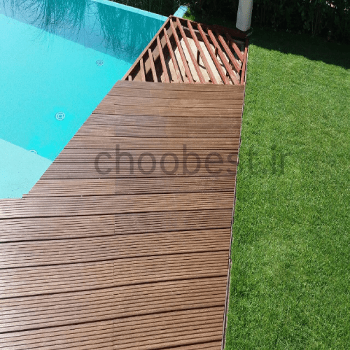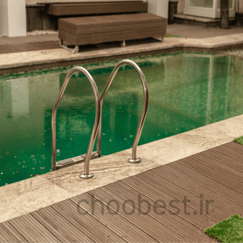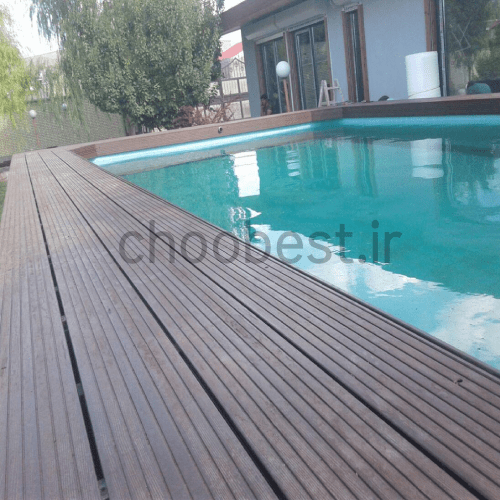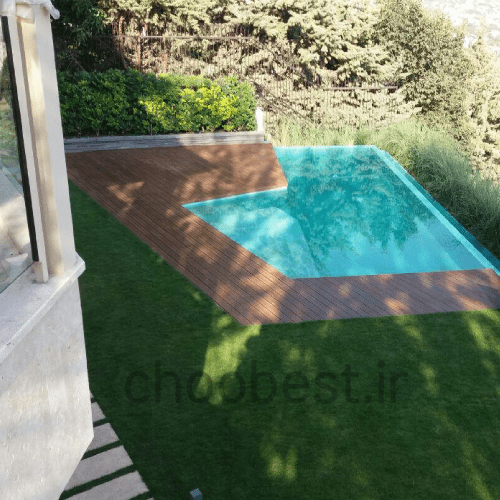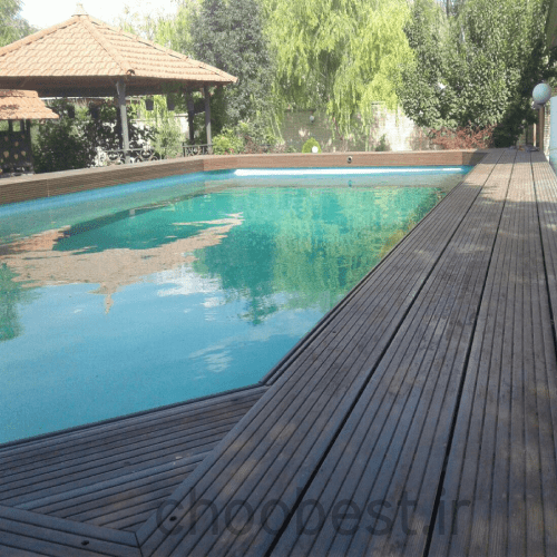 - کفپوش چوب پلاست دور استخر
